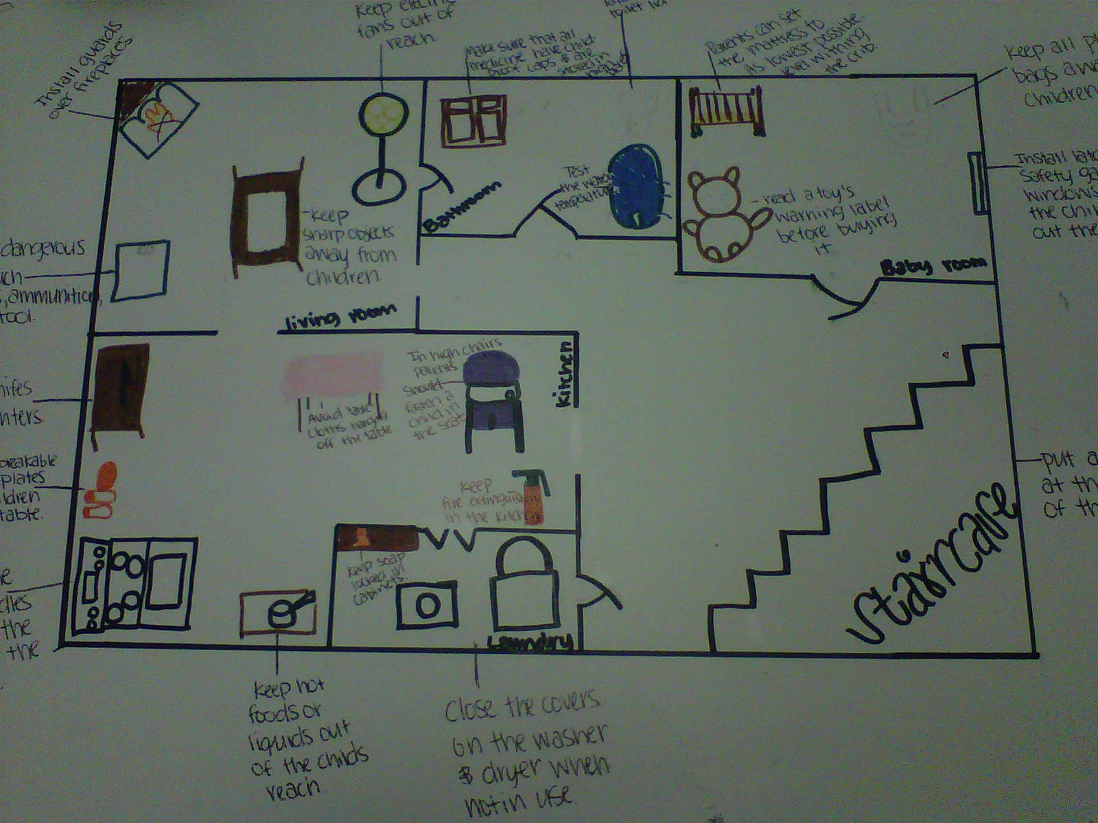 This project allowed students to not only creatively envision their own future home, but allowed them to apply the subject matter to the real world. Childproofing a home is what parents have to do usually once their children begin to crawl and this project educated my students on how they can childproof their future home if they decide to have children. My students can also apply this knowledge to their current home if they have younger siblings or younger individuals within their immediate or extended family. This project engaged students in learning how to keep children safe in the home environment, and the knowledge students learned from this objective and this poster project, helped them to understand the objectives that followed. For my occupational students, I modified this project by instructing them to draw objects that would fit in the rooms of their home. They had drawn the same number of objects listed on the rubric and when they were done, I sat down with them and discussed what they had drawn and how they can make that object safe for children. By doing this, my occupational students felt involved in the project and they responded well to the discussion once their objects were drawn.