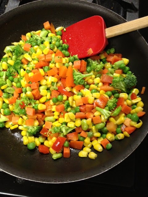 Vegetables!!!! Broccoli, Corn, Red Peppers, Carrots, and Peas cooked in a little bit of olive oil. Look at how colorful it is. Add baked chicken breasts on the side and you're set!
